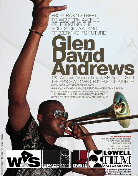 It’s all the buzz in Lowell right now — the “Crown Prince of Tremé”, Glen David Andrews, will be performing LIVE at Lowell’s Western Avenue Studios on Saturday, April 2! This exciting program was entirely organized by our dear friend Andy Smith, lover of New Orleans jazz and all around music aficionado. To enhance the already amazing music program, he invited the LFC to screen the equally amazing documentary Faubourg Tremé: The Untold Story of Black New Orleans, which documents the history and musical rise of one of the oldest African-American communities in America, which is also responsible for some of the nation’s most dynamic jazz music. It just so happens that the Research Director for the film was UMass Lowell History Professor Caryn Cossé Bell. Because of this fortunate fact, Ms. Bell will be in attendance at the screening to share her insight on the making of the film and all she learned during the process.
