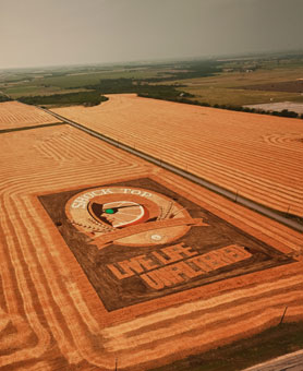 Well THIS is mighty interesting. As some of you may know, we’ll be screening Chris Ordal‘s acclaimed independent film Earthwork on Tuesday, September 13 at the Art Gallery at Jeanne D’Arc Credit Union, right here in Lowell. Coincidentally, we just learned that the subject of Ordal’s film, renowned crop artist Stan Herd, is actually IN BOSTON this month creating an earthwork as part of a marketing campaign for Shock Top Beer. Incredible! Apparently, Herd hit a couple of hot spots in the U.S. creating earthworks that feature the Shock Top logo — Austin, Orange County, and Boston were the targets for the tour which began in May. It’s a brilliant campaign, and hopefully an effective one for the Belgian brew and a lucrative one for Herd.