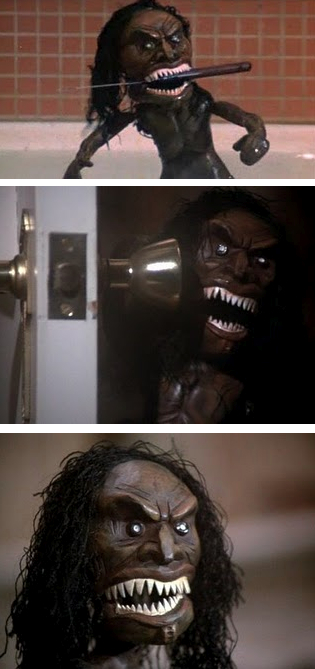 Our number one choice for most terrifying-thing-under-two-feet should come as no surprise. The African Zuni Fetish Warrior Voodoo Doll has struck fear and loathing in the hearts and minds of MILLIONS since his debut with scream queen mistress Karen Black in the final segment “Amelia” in Dan Curtis‘ Trilogy of Terror. To add to the thrill, this iconic trio of stories was actually a teleplay, not a theatrical film. How horrid to have this nightmare invade your comfy 1975 living room! Aired on ABC Television on March 4, 1975, Trilogy of Terror, which starred Karen Black in all three segments, was one of the few films on network television to carry the “parental discretion is advised” warning – makes it a winner in OUR book.